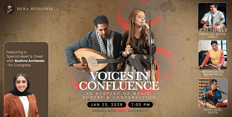 Join Hera Mubashir and Ronnie Malley for a captivating evening of music, poetry, and conversation. Voices in Confluence brings together South Asian and Middle Eastern musical traditions for a live conversation between lineages coming together in a shared musical exchange. Hera will be joined by Dhananjay Kunte on tabla, Hitesh Master on harmonium, and Sonny Patel on flute, adding rich instrumental depth to the evening. The event also features a special Meet & Greet with Bushra Amiwala (for Congress), offering a chance to connect with the artists and fellow attendees. Eyekhanic Eats food popup onsite!